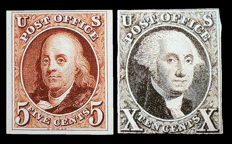 In 1847 the first U.S. postage stamps were issued. The stamps were issued at fixed prices, a big change from the previous method of determining the cost of postage based on the number of sheets in a letter and the distance it would travel. The 5- and 10-cent stamps issued then were engraved with images of Benjamin Franklin, the first Postmaster General, and George Washington respectively.